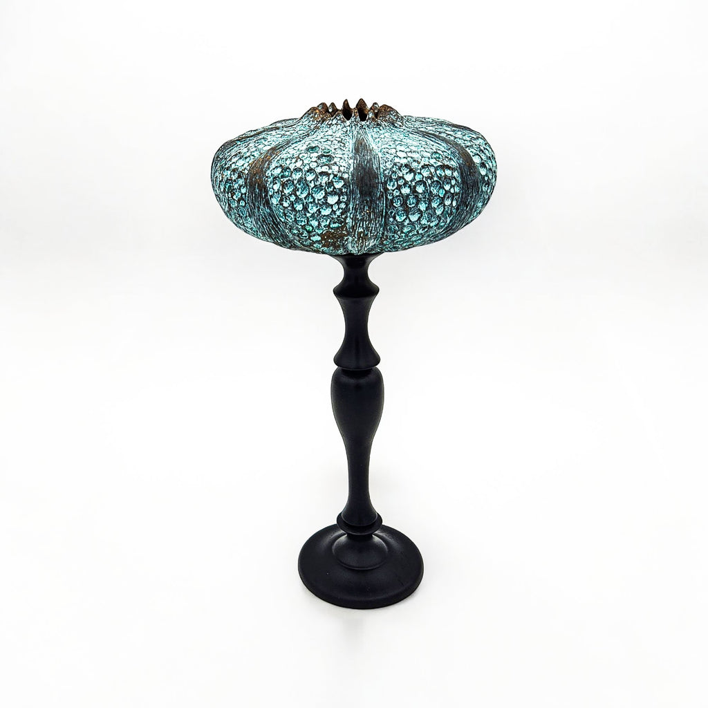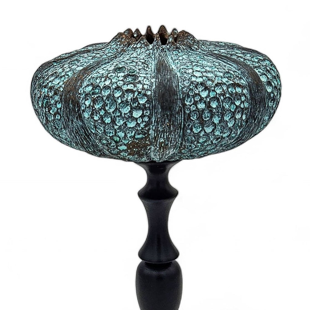 Medium: Aged Maple & Red Oak. Hollowed, carved, textured, and finished with coper patina acrylics.