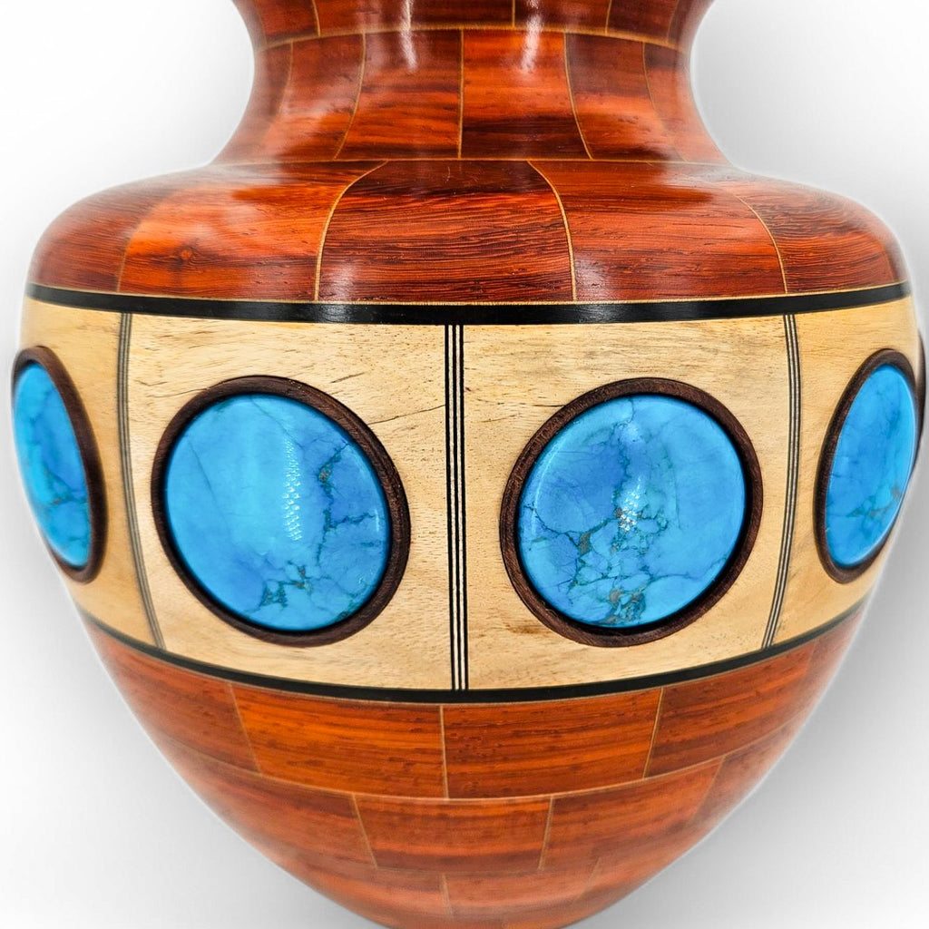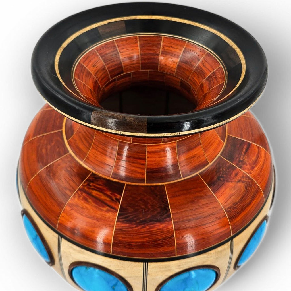 Artist: Heiko Weiner Title: Segmented Vessel with Stone Inlay (Turquoise-blue Howlite) Medium: Padauk, Ebony, Tamarind, veneers, and an inlay of Turquoise-blue Howlite Dimensions: 11"h x 9"w x 9"d