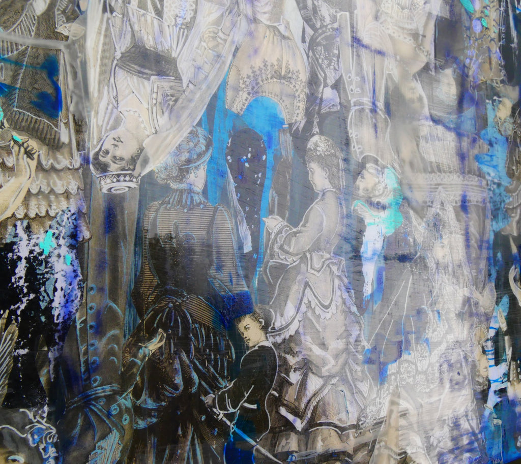 Medium: Vintage French "La Mode Illustrée" magazine pages, acrylic, ink, and resin on aluminum panel