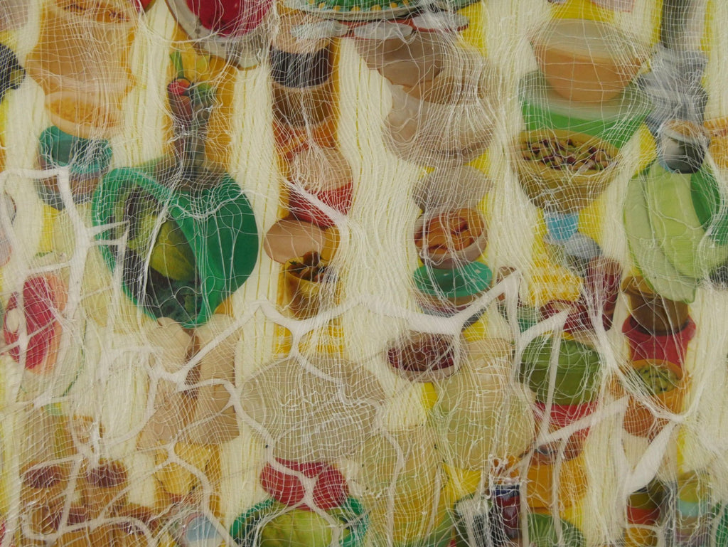 Medium: Vintage Tupperware catalog pages, netting, acrylic, ink and resin on aluminum panel