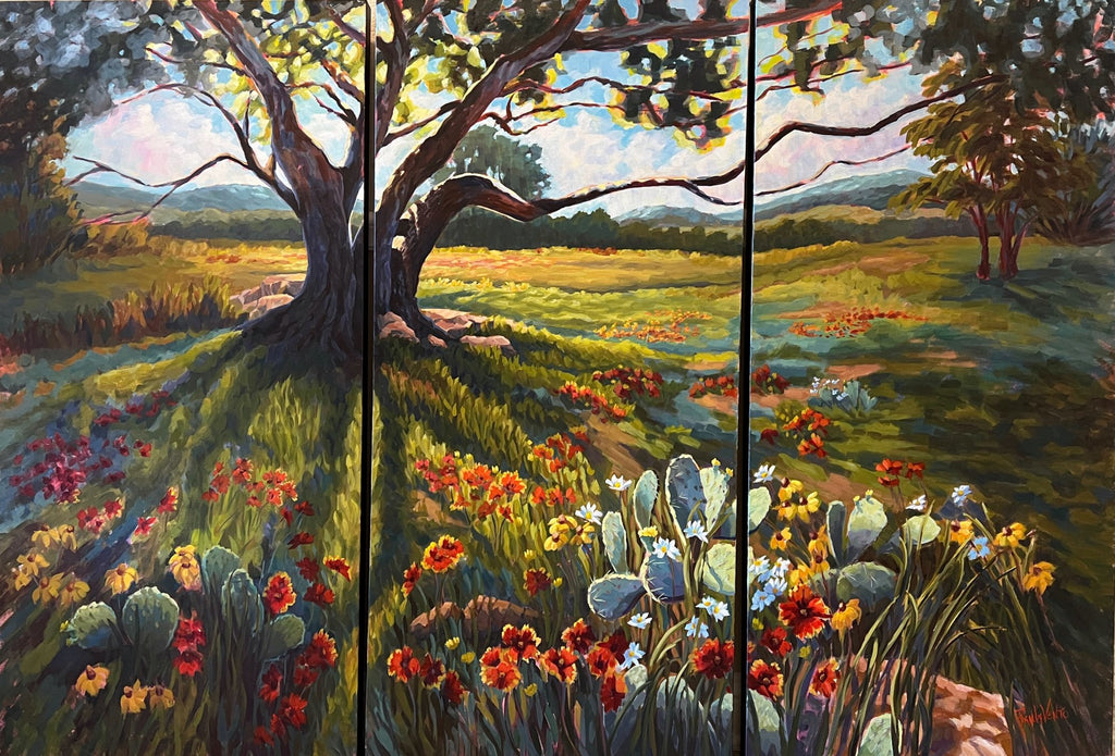 Medium: Acrylic on three canvases. Solid painted sides. Unframed.