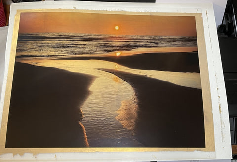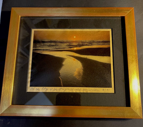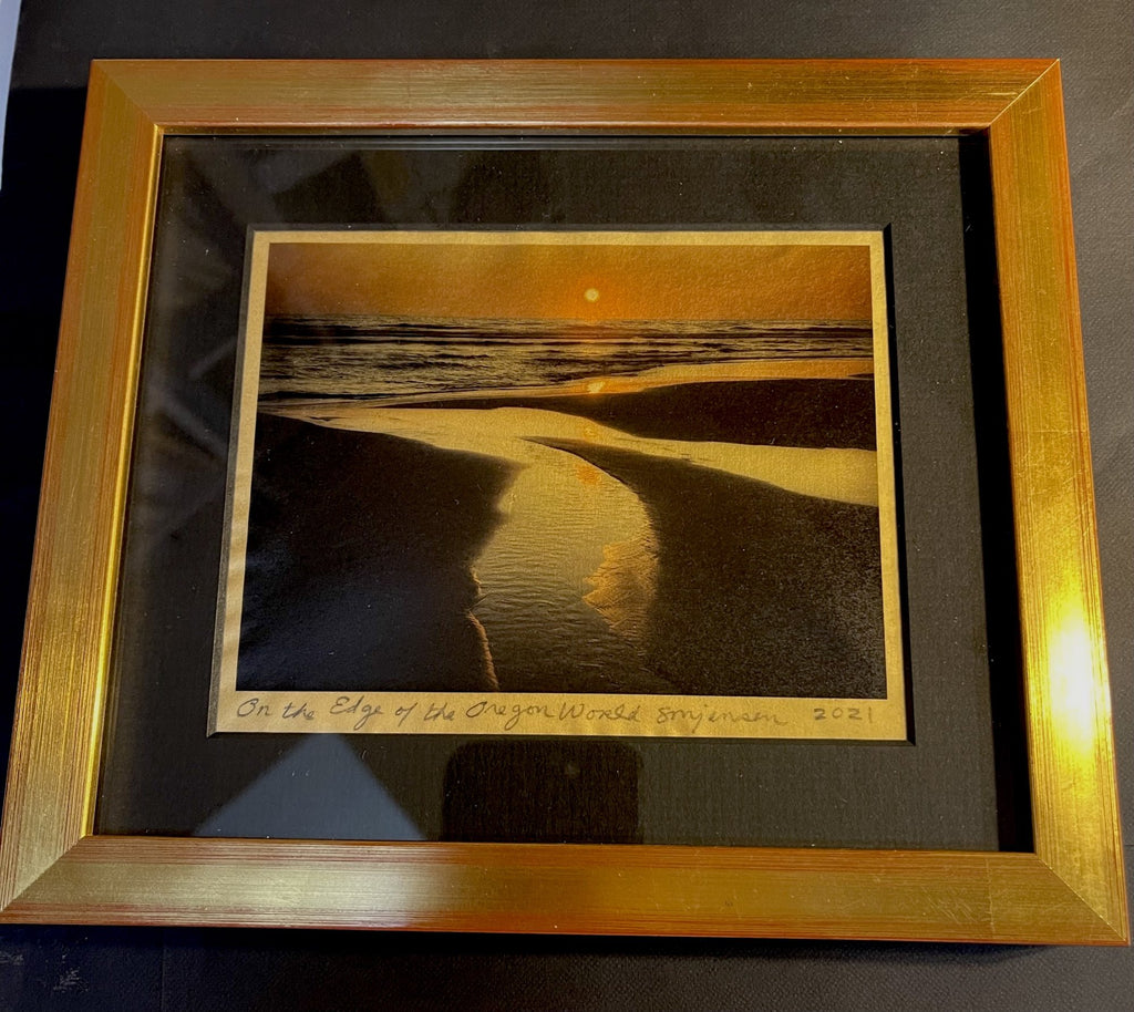 Artist: Sandy Brown Jensen Title: On the Edge of the Oregon World Medium: Gilded Photography. Inkjet print on transparency film hand-gilded on back with 24K gold Dimensions: 15"h x 20"w