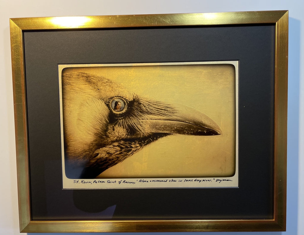 Artist: Sandy Brown Jensen Title: St. Kevin, Patron Saint of Ravens: "Alone & mirrored clear in love's deep river." Medium: Gilded Photography. Inkjet print on transparency film hand-gilded on back with 24K gold Dimensions: 12"h x 16"w