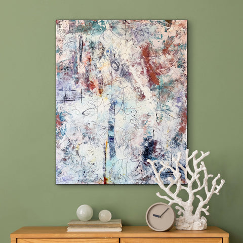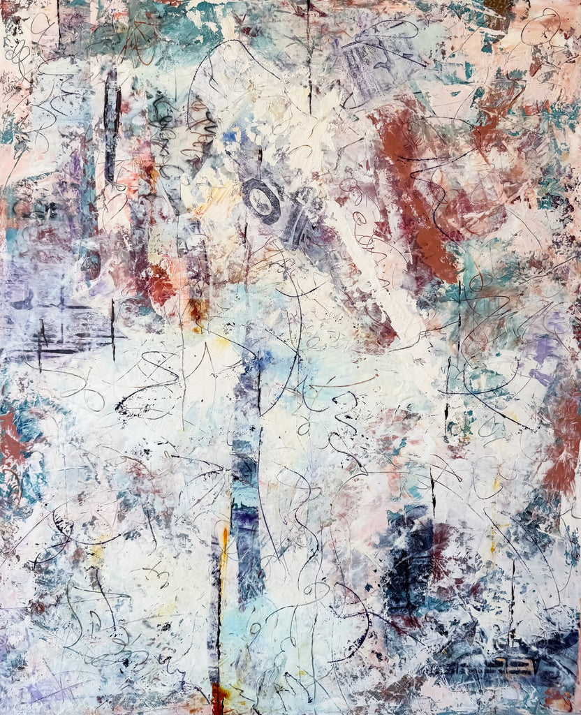 Medium: Oil paint, cold wax, and collage on cradled wooden panel