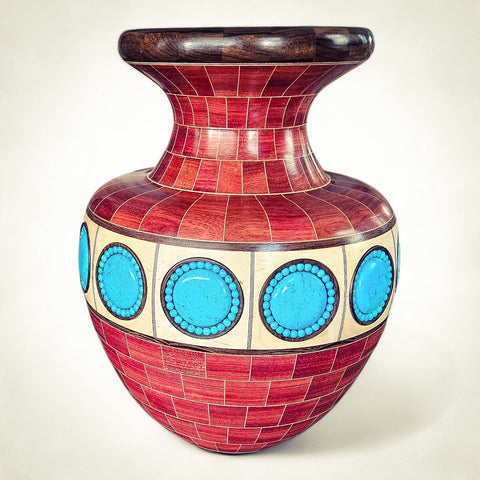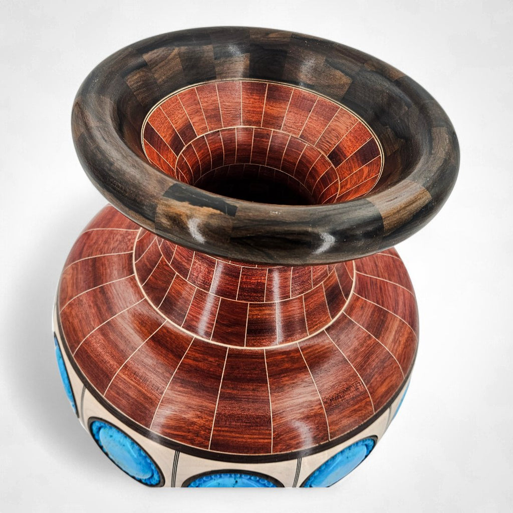 Artist: Heiko Weiner Title: LG Segmented Vase with Stone Inlays Medium: Bloodwood, Ziricote, Maple, misc. veneers, and turquoise-blue Howlite Dimensions: 16"h x 12"w x 12"d